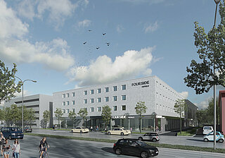 Zwei Gebäudeteile beherbergen jeweils ein *** - und ein ****-Sterne Hotel namhafter Hotelgruppen mit jeweils ca 200 Zimmern und einem Restaurantbereich, Konferenz- und Fitness.