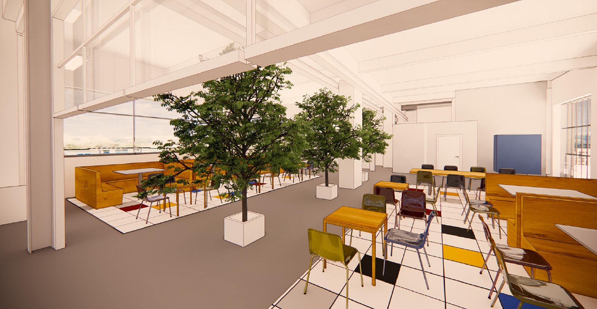 Die ehemalige Ausbildungshalle dient nun als moderne Firmenkantine und bietet eine attraktive Aufenthaltsqualität für die Mitarbeiter. Im Zuge der umfassenden Umstrukturierung wurden gezielt Fensterbrüstungen zurückgebaut, um großzügige, bodentiefe Fensterflächen zu schaffen. Dadurch wird eine optimale Tageslichtnutzung ermöglicht und eine helle, offene Atmosphäre geschaffen. Die vormals vorhandene Einfachverglasung wurde vollständig durch energieeffiziente Doppelverglasung ersetzt, wodurch sowohl thermische als auch akustische Anforderungen zeitgemäß erfüllt werden. Sämtliche brandschutztechnischen Maßnahmen wurden erfolgreich umgesetzt, um einen sicheren Betrieb der neuen Nutzungseinheit zu gewährleisten. Die technische Gebäudeausrüstung (TGA) wurde komplett erneuert und versorgt nun die Vollküche, einschließlich eines Fettabscheiders, gemäß den aktuellen technischen Anforderungen. Die Halle gliedert sich in zwei funktionale Bereiche: Der erste Bereich bietet rund 50 Sitzplätze für die Kantinennutzung, während eine Erweiterung flexibel möglich ist, um zukünftigen Kapazitätsanforderungen gerecht zu werden.