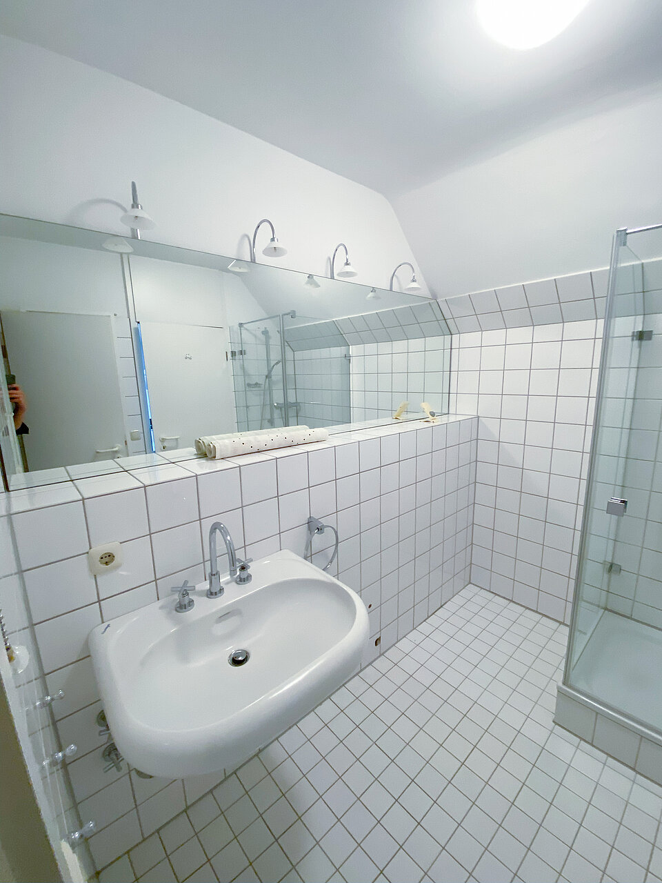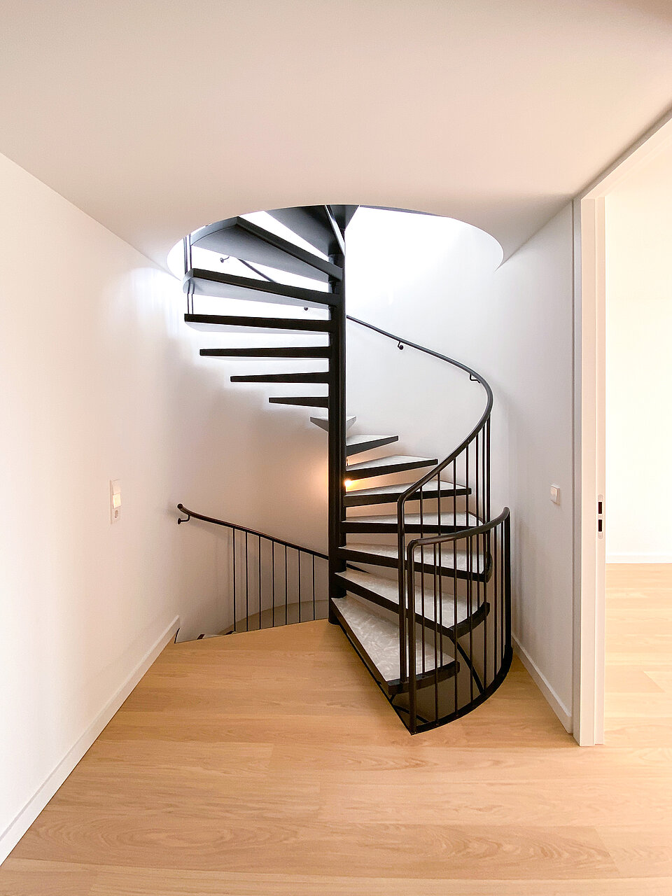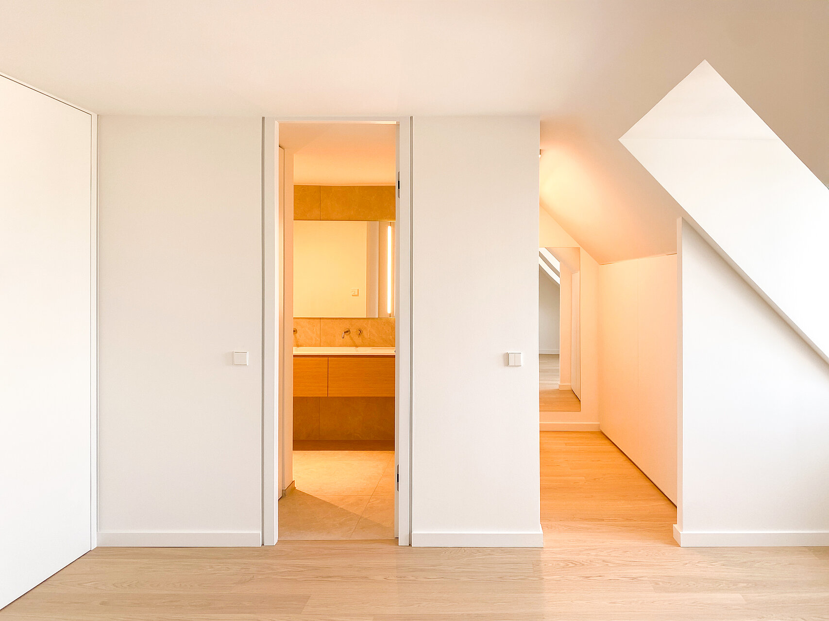 Die Penthouse-Maisonettewohnung in der Kölner Altstadt war in die Jahre gekommen und vor Neuvermietung war es unsere Aufgabe, durch wenige Interventionen zeitgemäße Wohnqualität zu schaffen. Materialität und Details wurden auf das Wesentliche reduziert, um Großzügigkeit, Klarheit und räumliche Wirkung zu erzeugen.