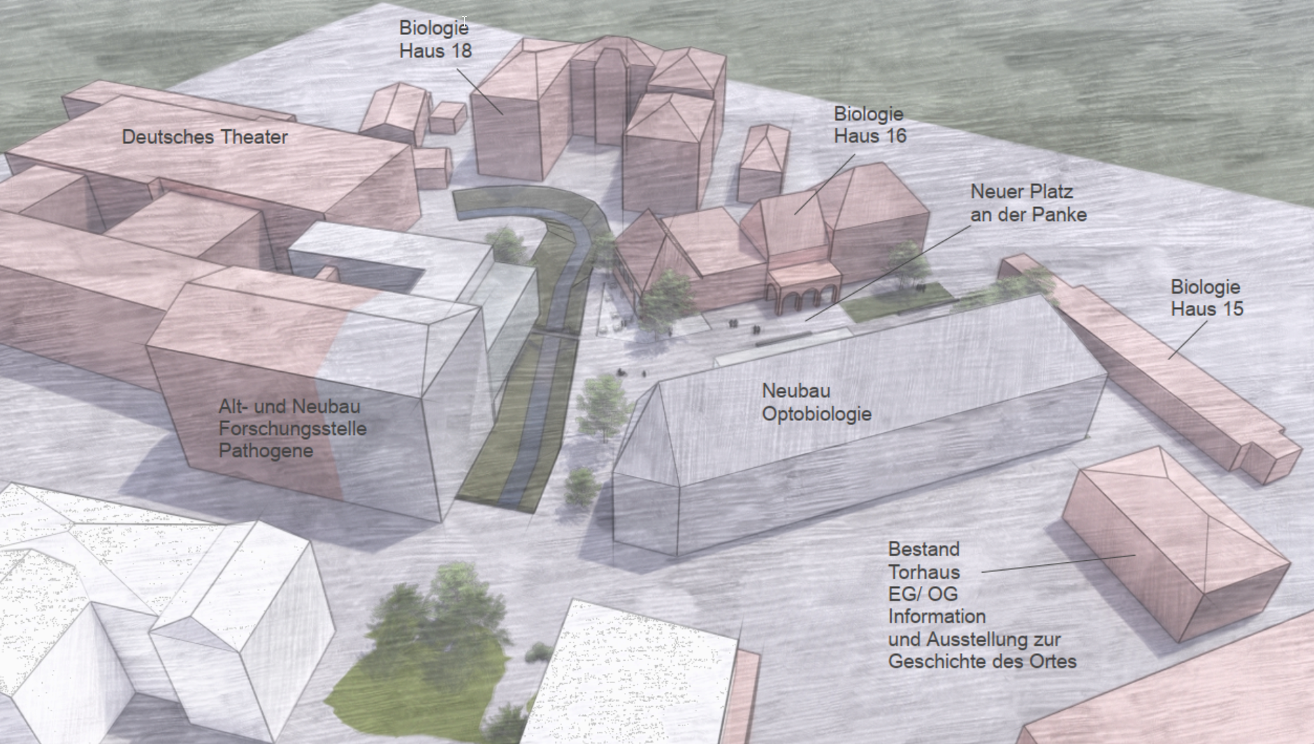 Beide Gebäude sind durch die wieder freigelegte Panke getrennt, gleichzeitig soll diese aber auch die Bereiche wieder als Brücke verbinden.