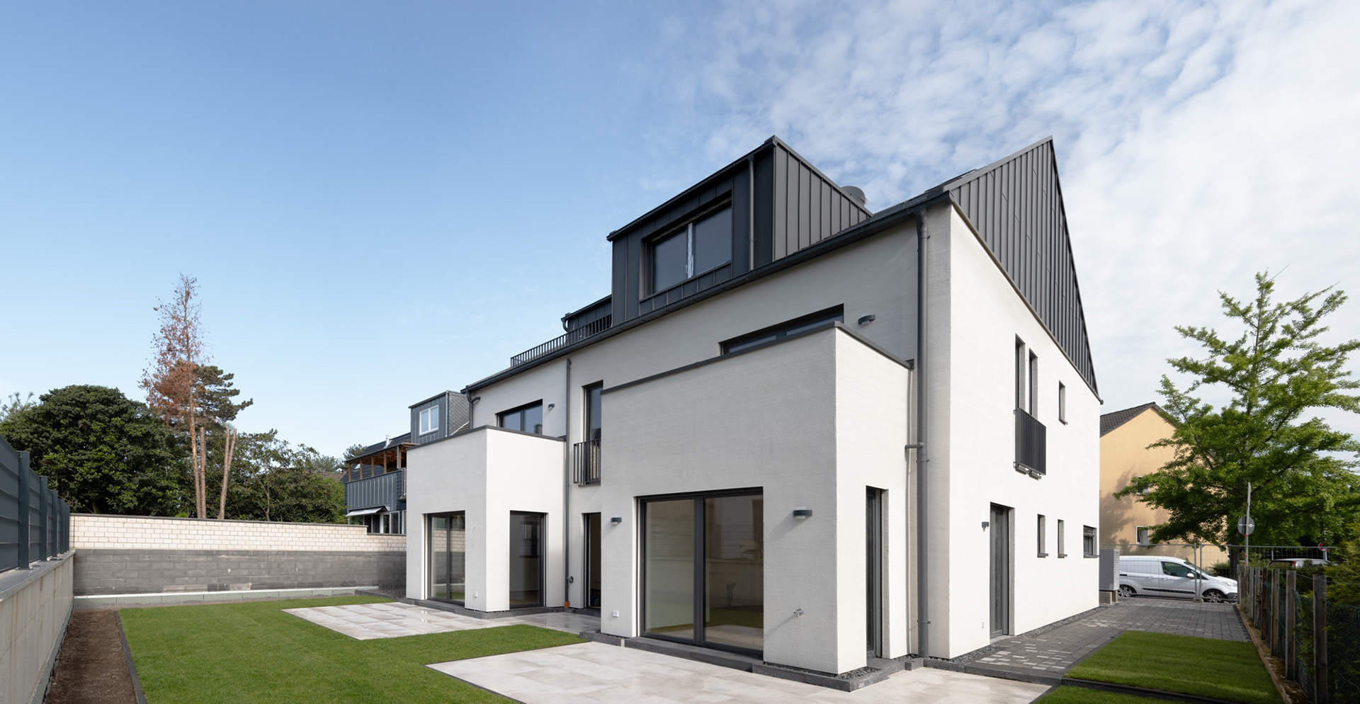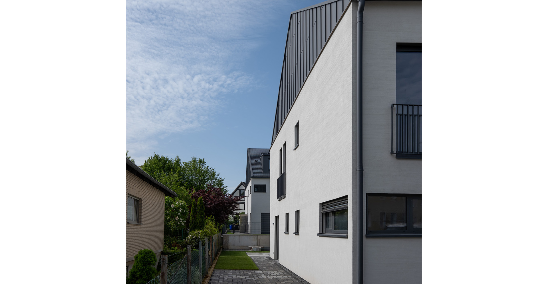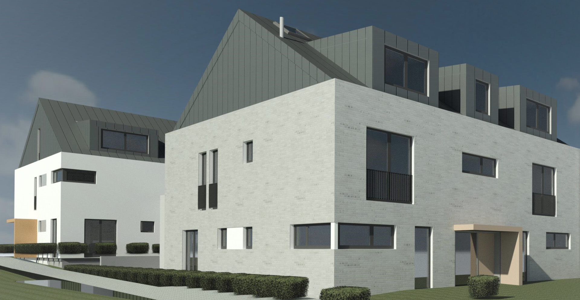 Auf einem innerstädtischen zusammengelegten Grundstück in Pulheim haben zwei Wohnhäuser mit jeweils fünf Wohnungen auf einer gemeinsamen Tiefgarage ihren Platz eingenommen. Die freistehenden Wohnhäuser wurden zweieinhalbgeschossig in Holz-Hybridbauweise errichtet, wobei die Außenwände im Holzrahmenbau und die Decken massiv aus Stahlbeton sind. Die Fassade der Wohnhäuser dominiert in einer sand-beige farbigen groben Putzfläche. Um eine harmonische Gestaltung zu erzielen, wurden die Dächer mit Titanzinkflächen verkleidet. Beide Häuser werden technisch autark, über Erdreichwärmepumpen versorgt und erfüllen den KfW55-Standard.