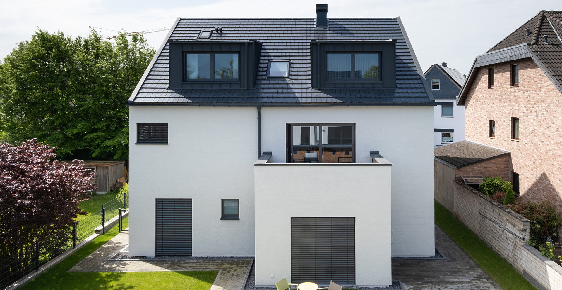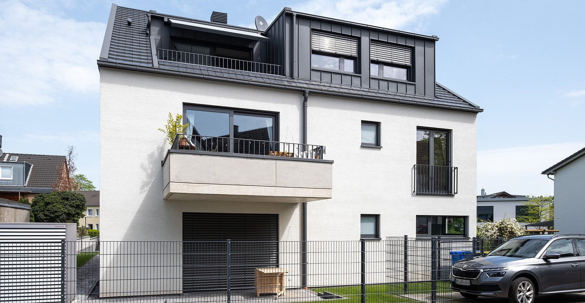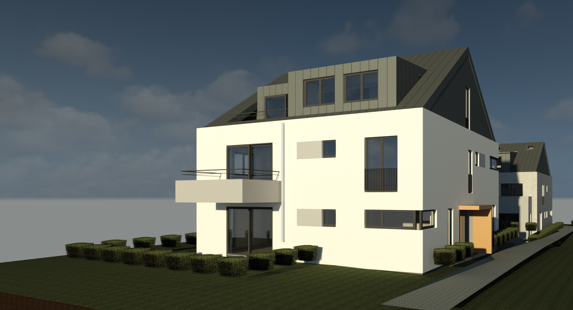 Auf einem innerstädtischen zusammengelegten Grundstück in Pulheim haben zwei Wohnhäuser mit jeweils fünf Wohnungen auf einer gemeinsamen Tiefgarage ihren Platz eingenommen. Die freistehenden Wohnhäuser wurden zweieinhalbgeschossig in Holz-Hybridbauweise errichtet, wobei die Außenwände im Holzrahmenbau und die Decken massiv aus Stahlbeton sind. Die Fassade der Wohnhäuser dominiert in einer sand-beige farbigen groben Putzfläche. Um eine harmonische Gestaltung zu erzielen, wurden die Dächer mit Titanzinkflächen verkleidet. Beide Häuser werden technisch autark, über Erdreichwärmepumpen versorgt und erfüllen den KfW55-Standard.