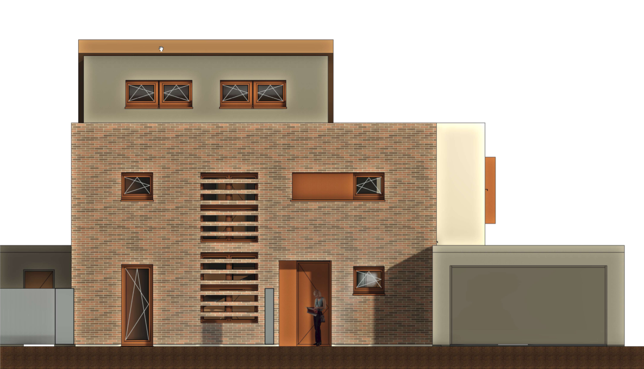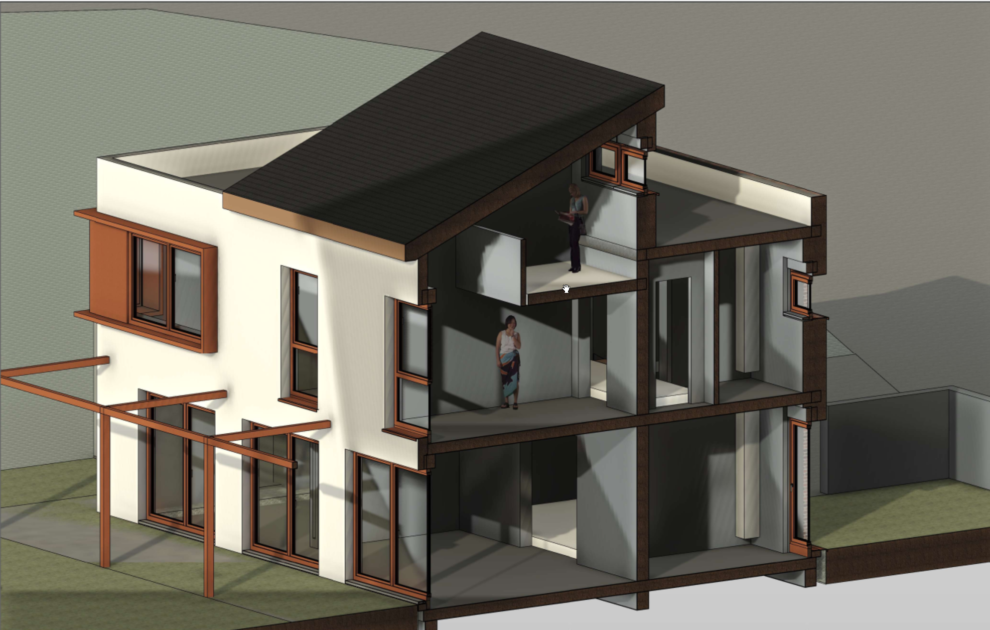 Gebaut wird ein frei stehendes Wohnhaus in Holzrahmenbau und massiven Brettschichtholzdecken. Die Grundrisse sind nach den Lärmschutzbelastungen ausgerichtet mit den Wohn- und Schlafräumen zur Gartenseite geöffnet in Südwestrichtung. Eine geschlossene Nordfassade mit Verklinkerung schirmt das Gebäude formal ab.