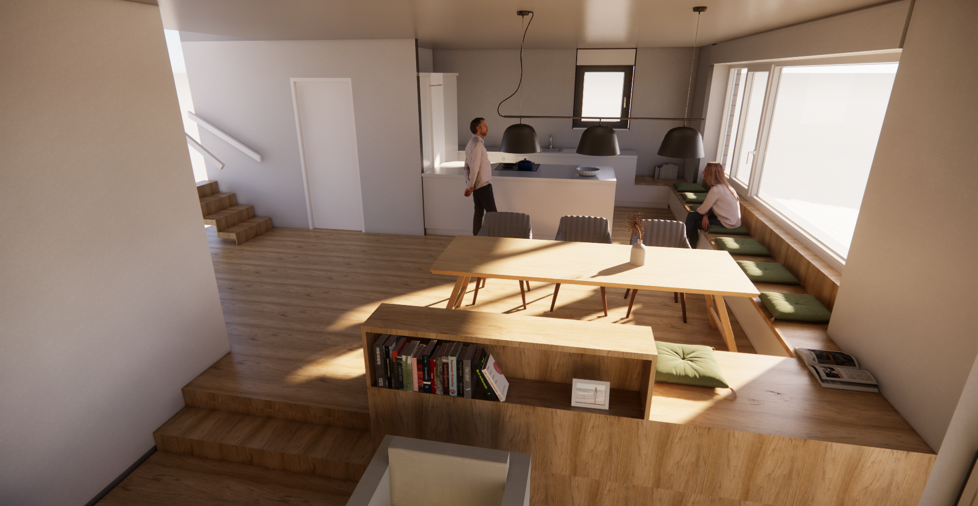 In Swisttal entstand ein neues Zuhause für eine Familie – als Zeichen der Hoffnung und des Wiederaufbaus nach der verheerenden Flut im Jahr 2021. Nach einem intensiven Austausch mit den Bauherren wurde ein nachhaltiges Staffelgeschoss-Wohnhaus im KfW 40+ Standard entwickelt, das Sicherheit, Energieeffizienz und Wohnqualität verbindet. Der Aufbau erfolgt auf dem verfüllten Altbaukeller, darüber liegt ein umlaufender Betonsockel in Sichtbeton, ausgeführt als „weiße Wanne“ mit integriertem Dammbalkenschutzsystem. So wird das Gebäude dauerhaft gegen Hochwasser bis +1,80 m über Straßenniveau geschützt und gleichzeitig gestalterisch mit der Landschaft verankert.
