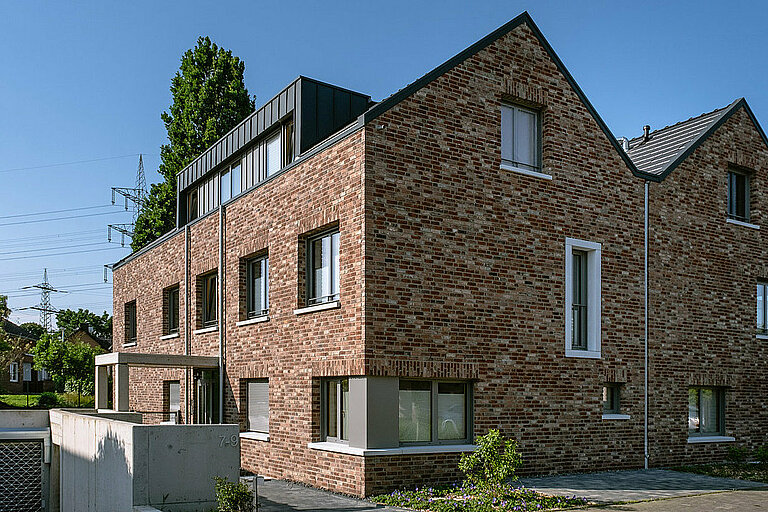 Das Mehrfamilienhaus mit 8 Wohnungen und Tiefgarage ist fertiggestellt. Zwei aneinanderliegende Häuser mit Klinker Fassade stechen in Pulheim in Erscheinung.