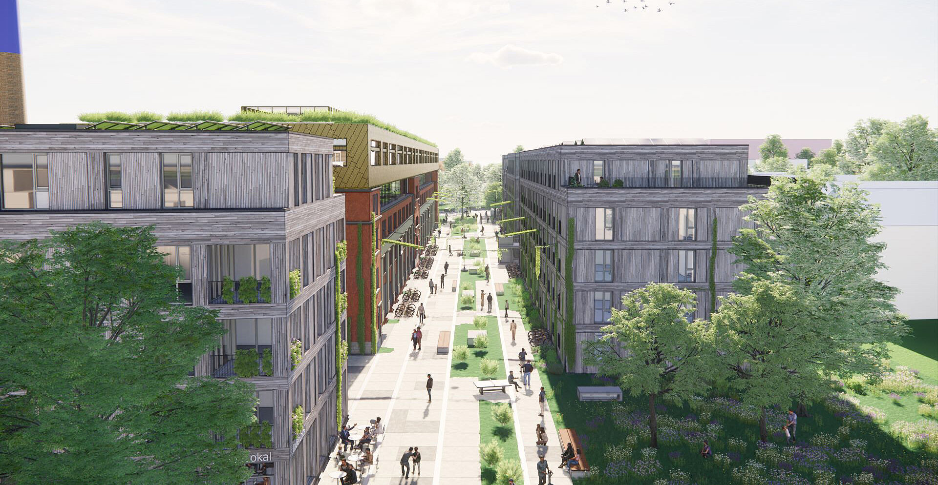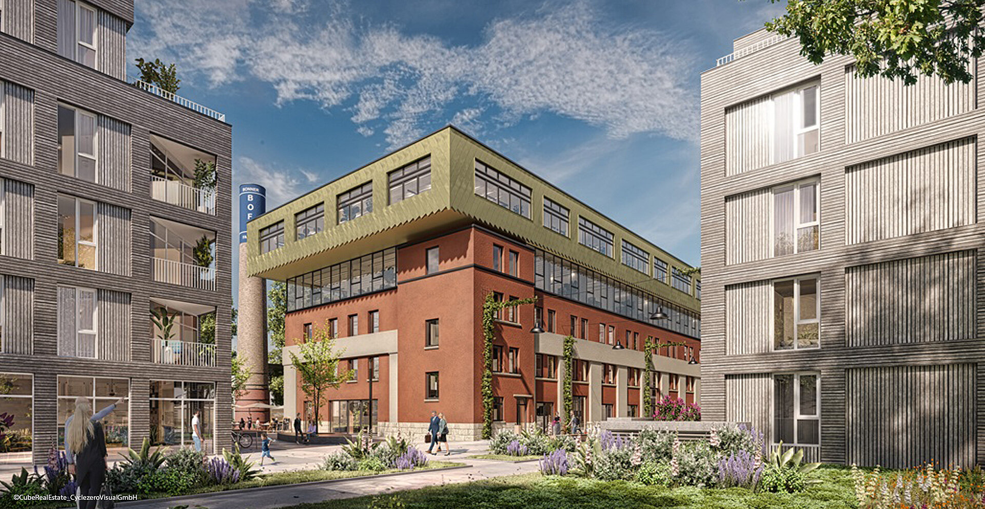 Die Bonner Fahnenfabrik zählte im 20. Jahrhundert zu den bedeutendsten Fahnenherstellern Deutschlands. Auf dem historischen Areal in unmittelbarer Nähe zum Rhein entwickelt die Cube Real Estate GmbH ein modernes Stadtquartier, das Wohnen und Arbeiten mit dem Charme der Geschichte verbindet. Durch die behutsame Sanierung und Aufstockung des bestehenden Gebäudes entsteht ein attraktiver Büro- und Gewerbekomplex. Ergänzt wird das Ensemble durch drei Neubau-Mehrfamilienhäuser mit Tiefgarage, die vielfältige Wohnformen bieten – vom kompakten Apartment bis zur klassischen Familienwohnung. Im Erdgeschoss des Bestandsgebäudes sind Flächen für Gastronomie und Außengastronomie vorgesehen, während die oberen Etagen zu hochwertigen Büroflächen ausgebaut werden. So entsteht ein urbaner Raum mit hoher Aufenthaltsqualität, der Tradition und Moderne harmonisch vereint.