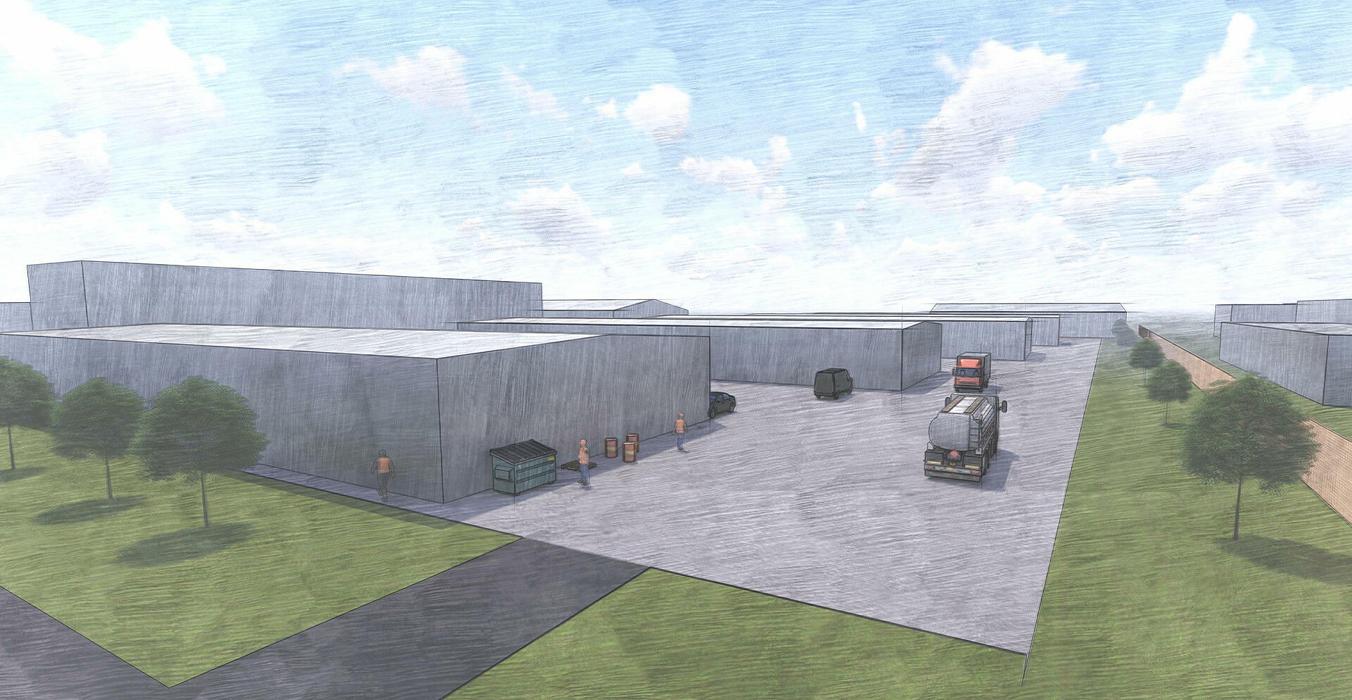 Dem Konzept liegt die Idee zugrunde, dass innerhalb einer eingeschossigen Halle Nutzungseinheiten für verschiedene Gewerbenutzungen, Lager- , Verkaufs- oder Handwerksbetriebe angeboten werden können. Die ca. 18m breiten, stützenfreie Hallen sind mit den entsprechenden Toren, Türen und Fenster für eine spätere Abtrennung von Einheiten ausgestattet. Der Hallengrundriss ist modular aufgebaut. Ein Modul umfasst eine Grundfläche von ca. 10 x 10 m im Achsraster der Tragstruktur. Die Module können beliebig miteinander kombiniert werden, sodass Nutzungen über mehrere Achsen entstehen können. Nach einer Marktstudie hat sich herausgestellt, dass in vergleichbaren Gewerbeparks überwiegend ein Modul genutzt wird, also eine Nutzfläche von ca. 100 qm gefragt ist. Der Anteil an Doppeleinheiten beträgt zwischen 20 und 25 %. Jedes Modul verfügt über eine Heizung, eine abgeteilte WC-Einheit und einen Technikübergabepunkt. Die Erschließung erfolgt zentral über die Zufahrt von der Toyotaallee.
