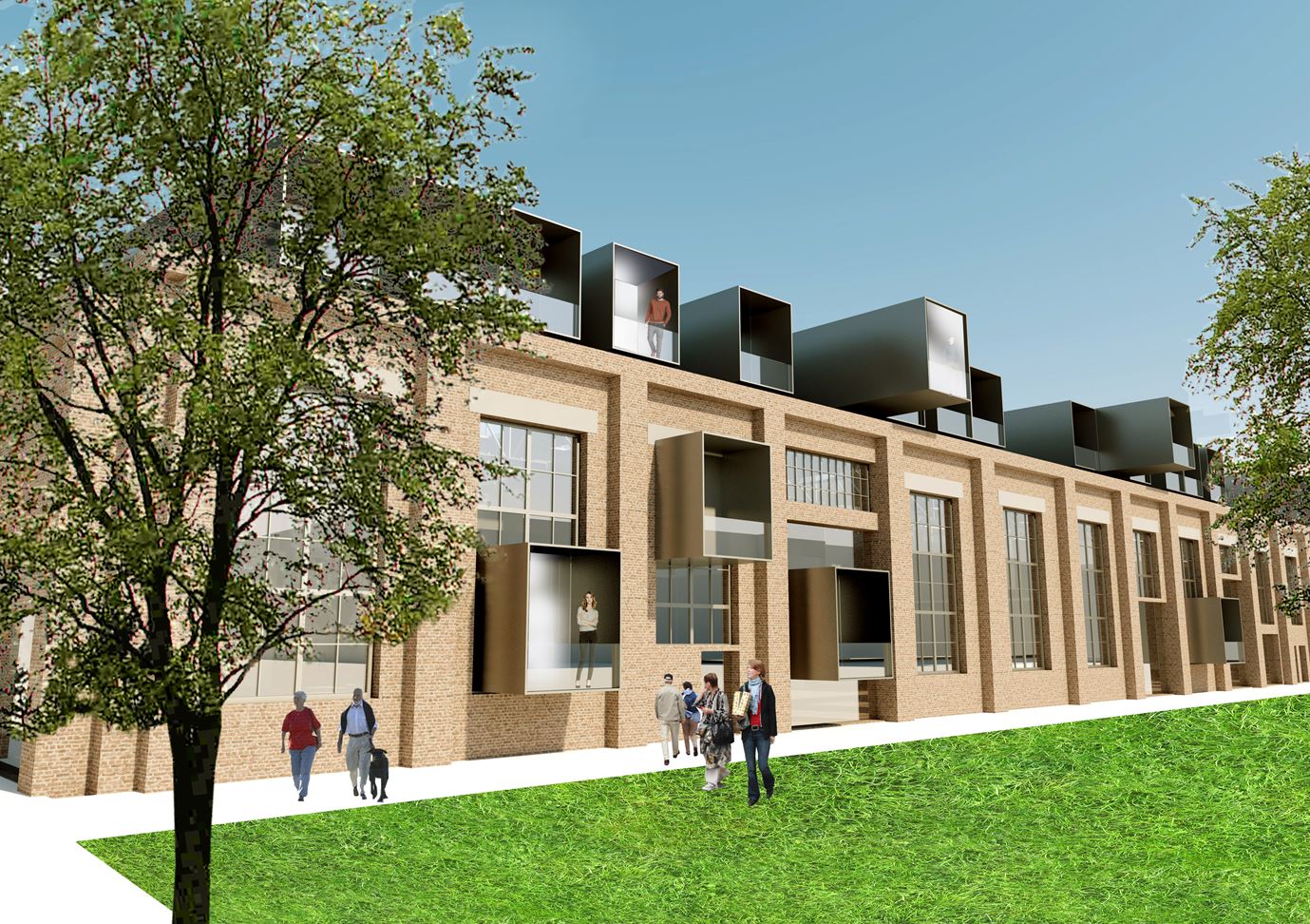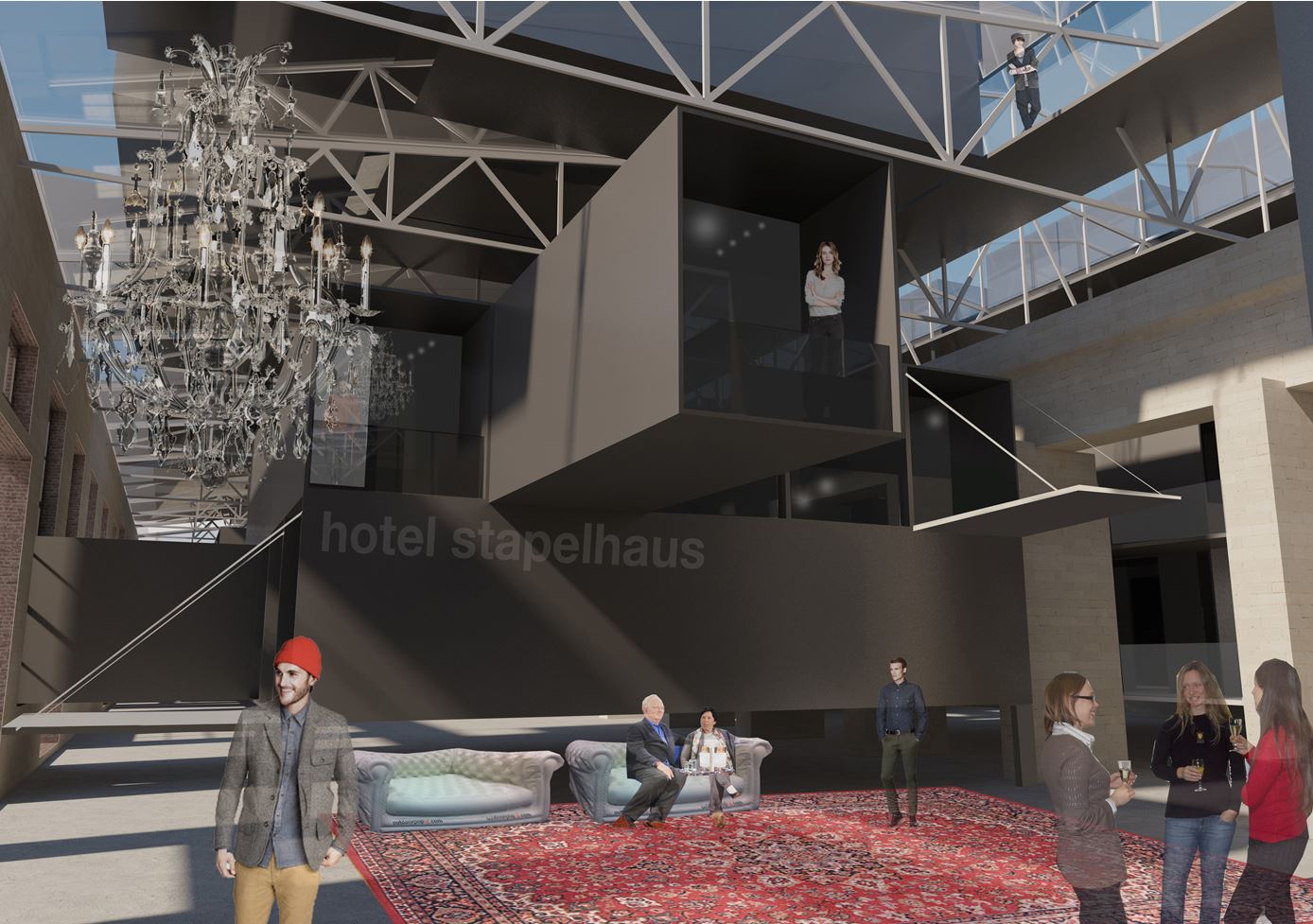 Unser Entwurf sieht eine Mischnutzung als Hotel bzw. Boardinghaus mit Einheiten für Studenten, Senioren und auch eine Kita auf Basis von Containereinheiten vor; dabei sollte die denkmalgeschützte Halle bewusst als eigenständig erhalten bleiben.