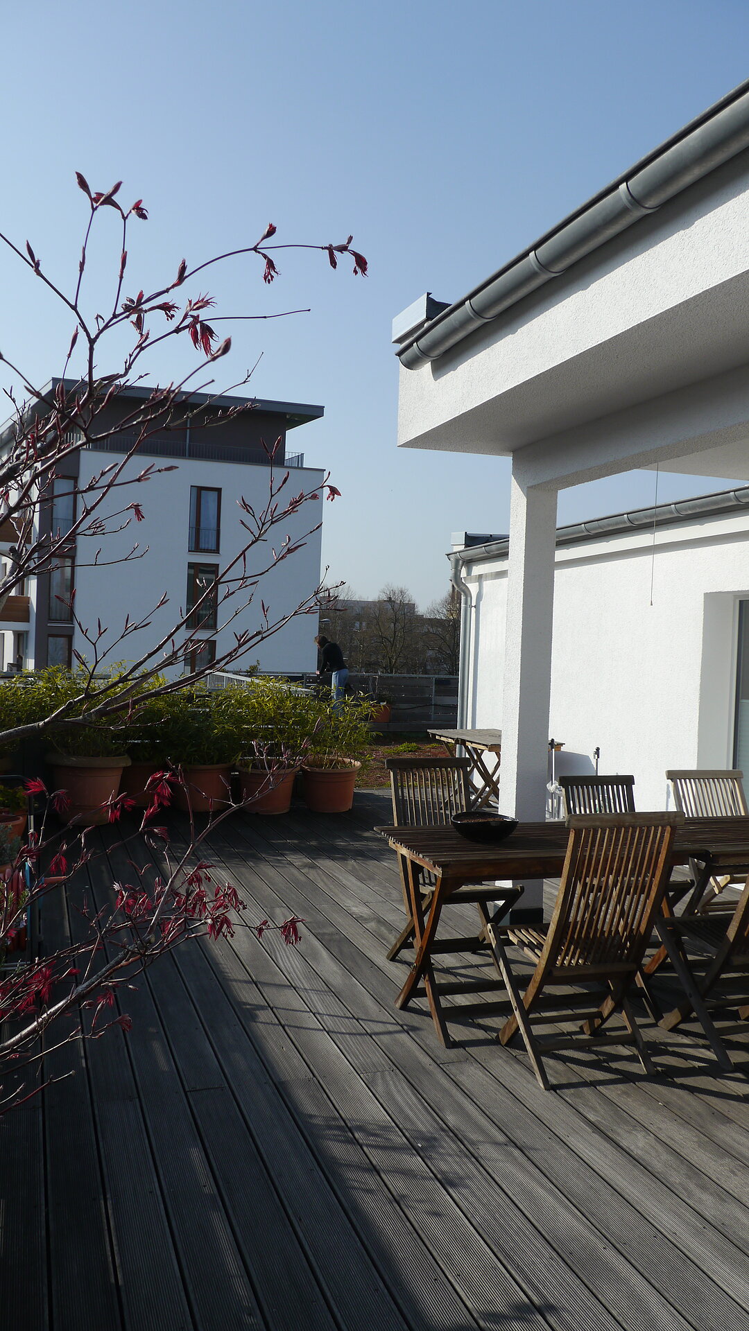 Das Flachdach über der Wohnebene im 1.OG wurde bereits mit einer Treppe und einem kleinen Personenaufzug erschlossen.