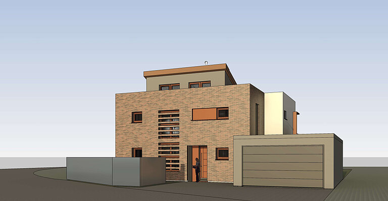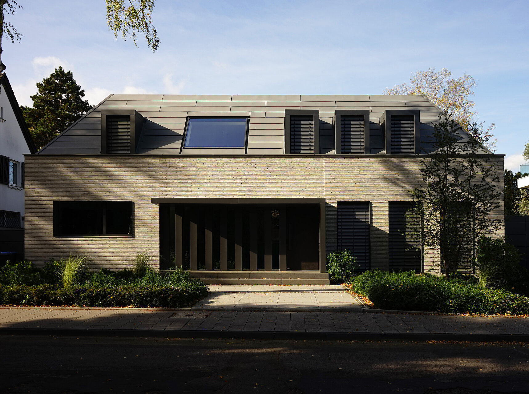 In einem westlichen Kölner Vorort entstand dieses moderne Wohnhaus mit Einliegerwohnung für einen privaten Bauherrn. Die Architektur des Hauses ist ein Zeugnis des Dialogs zwischen traditionellen und modernen Materialien.