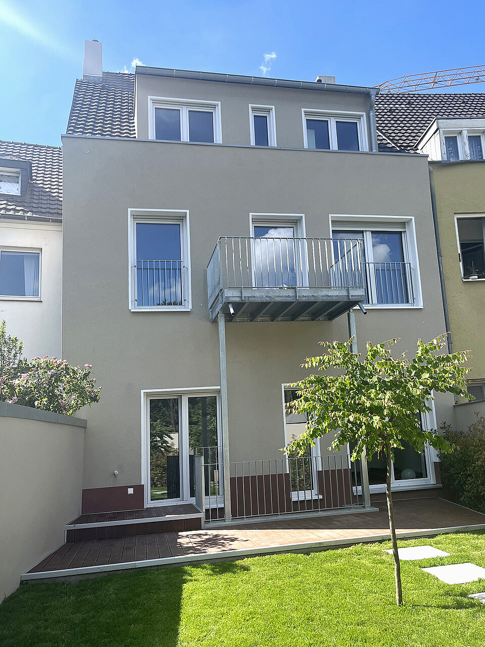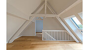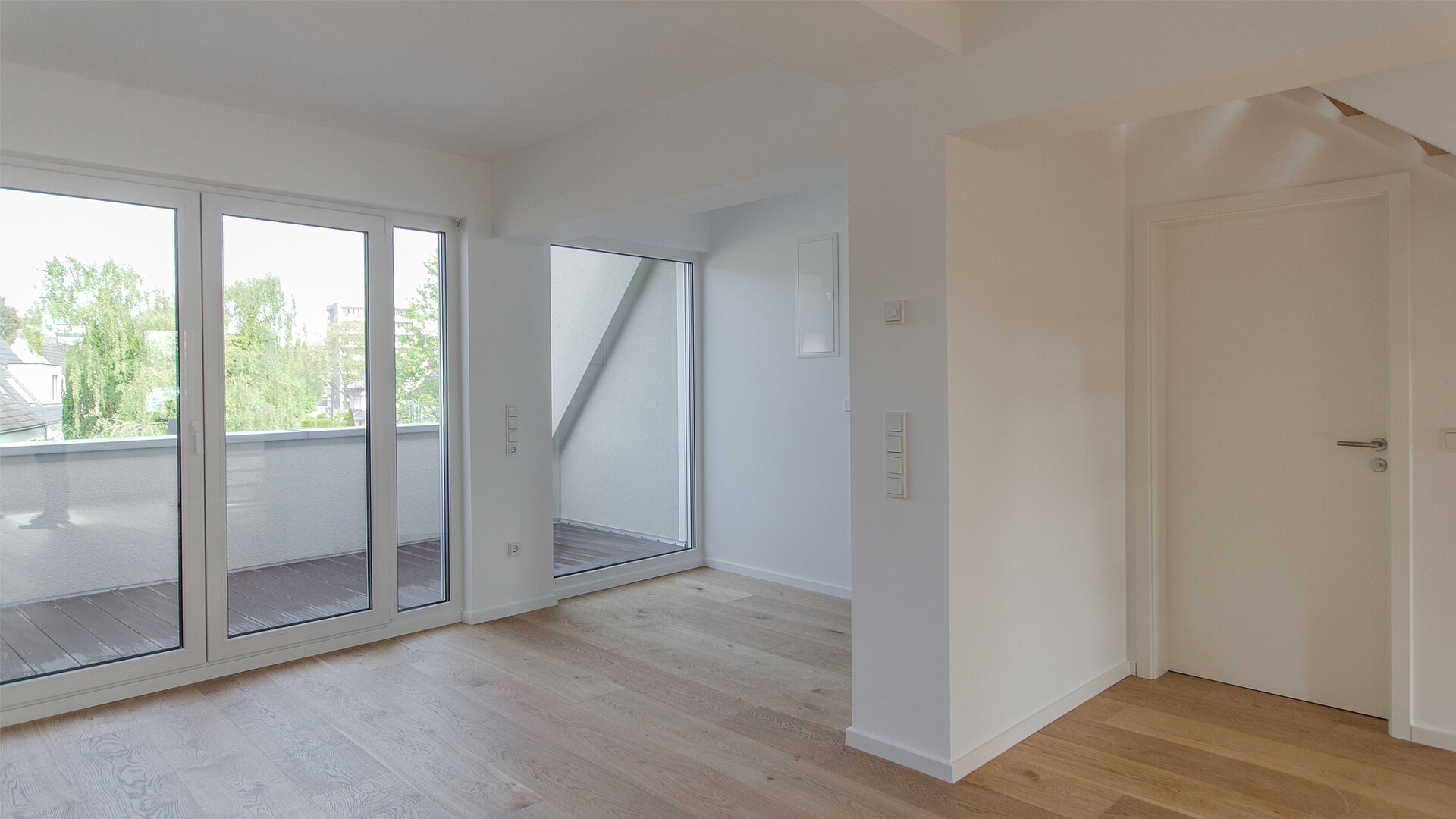 Im ersten Obergeschoss befindet sich eine rund 70 qm große Wohnung mit Balkon in Süd-Ost Richtung. Großzügige, raumhohe Fensterelemente durchfluten den offenen Wohn-Ess-Kochbereich mit Licht. Ein komfortables Schlafzimmer mit Ankleide sowie ein modernes Duschbad runden das Raumangebot ab. Im Dachgeschoss unter Einbeziehung des jetzt ausgebautem Spitzboden ist eine rund 83 qm große Maisonette-Wohnung entstanden. Die offene Wohnebene führt auf eine Dachterrasse mit Blick auf Alt-Müngersdorf. Eine einläufige Treppe verbindet den Wohn-Ess-Bereich mit dem Spitzboden, in dem ein lichtdurchfluteter Raum mit Atelierverglasung, eine weitere Terrasse sowie ein Tageslichtbad mit Badewanne ein besonderes Wohnambiente schafft.