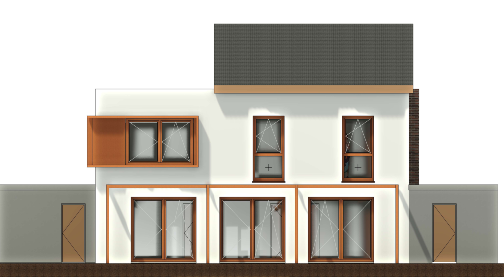 Gebaut wird ein frei stehendes Wohnhaus in Holzrahmenbau und massiven Brettschichtholzdecken. Die Grundrisse sind nach den Lärmschutzbelastungen ausgerichtet mit den Wohn- und Schlafräumen zur Gartenseite geöffnet in Südwestrichtung. Eine geschlossene Nordfassade mit Verklinkerung schirmt das Gebäude formal ab.