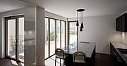Der kompakte Baukörper nutzt das Raumangebot optimal und schafft auf drei Ebenen eine Wohnfläche von über 150 m². Ein zentrales Gestaltungselement ist der durchdachte Lichthof, der über alle Geschosse hinweg für eine großzügige Tageslichtversorgung sorgt. Bodentiefe Fensterflächen ermöglichen eine gleichmäßige Belichtung bis in die hinteren Wohnbereiche und schaffen eine helle, offene Atmosphäre. Die Holzrahmenbauweise bietet nicht nur architektonische und gestalterische Vorteile, sondern überzeugt auch durch ihre schnelle Bauweise und die warmen, natürlichen Oberflächen, die ein angenehmes Raumklima schaffen. Zudem entspricht das Gebäude den Anforderungen des KfW-55-Standards und erfüllt damit höchste Ansprüche an Energieeffizienz und Nachhaltigkeit.
